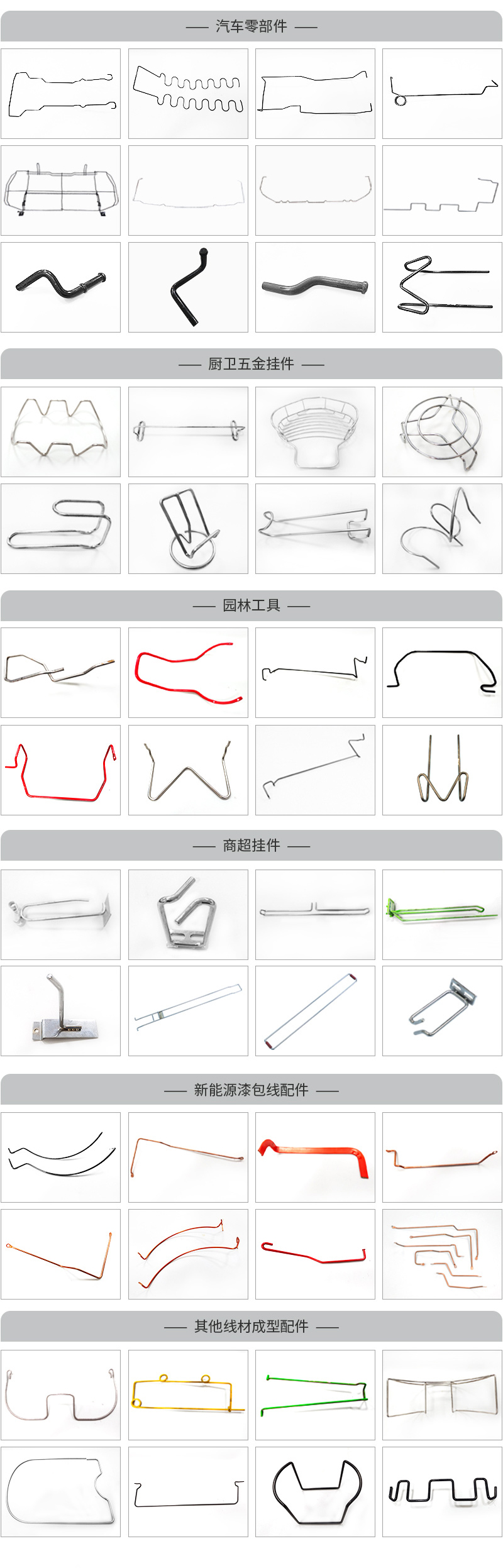 主要應(yīng)用于汽車零部件行業(yè),其中包含汽車座椅鋼絲、汽車座椅配件成型;寵物籠配件;衛(wèi)廚五金配件;園林工具配件、電子產(chǎn)品成型、玩具配件成型、電器配件成型、運(yùn)動器材配件成型、 文具配件成型、儀器配件成型、儀表配件成型、發(fā)飾配件成型、廚衛(wèi)掛件配件成型、 工藝品成型、超市貨架配件成型等所需的各類高精密金屬線材成型配件領(lǐng)域。