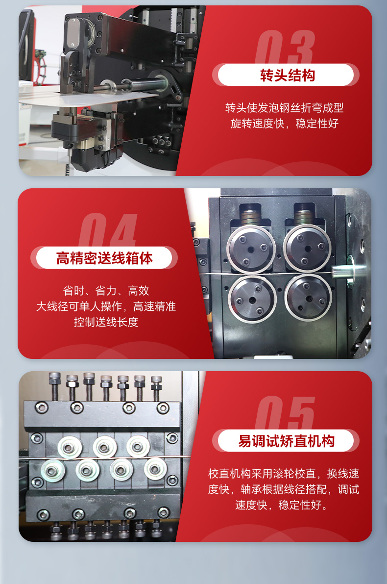 產(chǎn)品特點(diǎn):調(diào)試和切換產(chǎn)品更方便,無需頻繁更換工裝夾具,成形空間更靈活;產(chǎn)品通過頭部旋轉(zhuǎn)成型產(chǎn)品,可成型100-600mm長鋼絲件及不對稱產(chǎn)品(汽車發(fā)泡鋼絲);頭部旋轉(zhuǎn)設(shè)計(jì)根據(jù)產(chǎn)品特定,可靈活高速旋轉(zhuǎn),提高產(chǎn)品生產(chǎn)效率。
